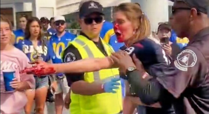 One woman was left bloodied after shocking footage showed her wearing a No. 99 J.J. Watt Texans jersey and getting pummelled by another female in Rams gear. She also appeared to take a few shots from other men in the stands.