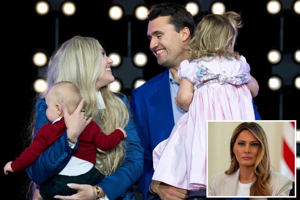 Charlie Kirk, his wife, Erika, and their two young kids in an undated social media post.Instagram/mrserikakirkFirst lady Melania Trump attends a meeting at the White House on Sept. 4, 2025.AP