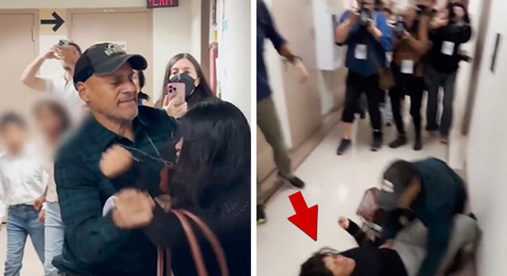 At least a dozen people — including photographers — are seen in the hallway with many of them calling out the agent. Two children — visibly upset — crowd around the woman on the floor.