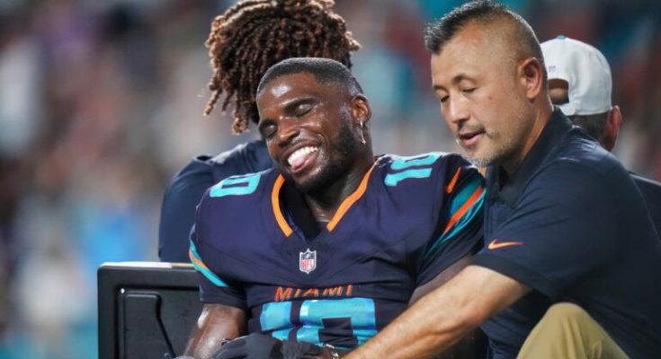 Miami Dolphins star wide receiver Tyreek Hill was taken to a local hospital after suffering a gruesome knee injury on Monday night as his team took on the New York Jets.