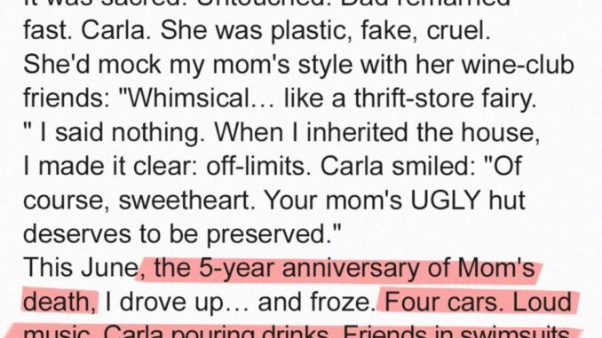 On the anniversary of Mom’s death, I drove there to spend the day alone — and found strangers’ cars in the driveway, music blaring. Through the window, I saw Carla and her friends drinking, laughing, and using my mom’s handmade pillow as a footrest.It turned out Carla had stolen my spare key from my apartment while I was away, planning a “gathering” at the house. She dismissed my anger, saying I was “dwelling on the past.”