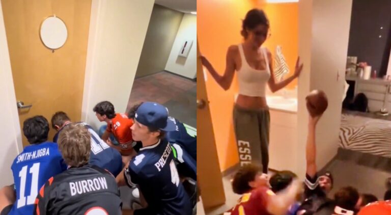 In a new video that has gone viral, a group of six young men (all wearing different NFL jerseys) decided to perform the tush push together. On three occasions, they had a friend open a door and perfectly executed the play: