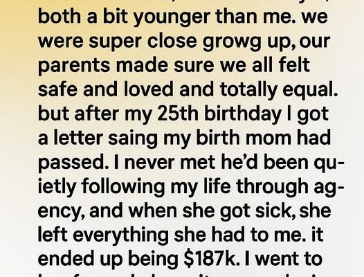 Everything changed on my twenty-fifth birthday. I received an unexpected letter from a lawyer I had never heard of. Inside was news that turned my world upside down. My birth mother, Alina, had passed away and left her entire estate to me — a total of $187,000. Reading those words, I felt a mix of emotions: grief for the woman I never got to know, confusion about why she had chosen me, and gratitude for the unexpected gift. I thought my family would share my complicated feelings, offer comfort, and maybe help me process what it all meant. Instead, their reaction broke me in ways I hadn’t imagined.
