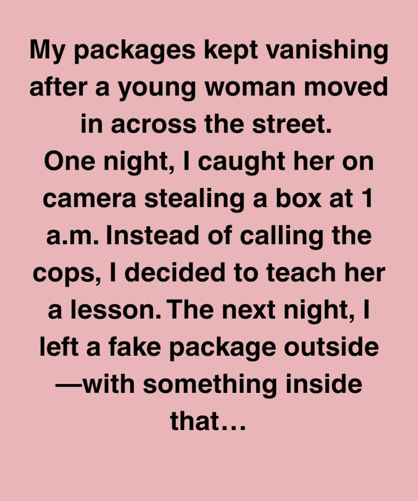 My packages kept vanishing after a young woman moved in across the street. One night, I caught her on camera stealing a box at 1 a.m. Instead of calling the cops, I decided to teach her a lesson. The next night, I left a fake package outside—with something inside that would make sure she’d never forget what she did.