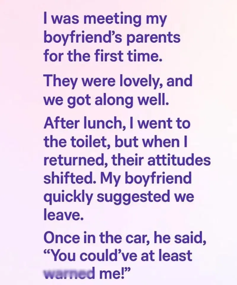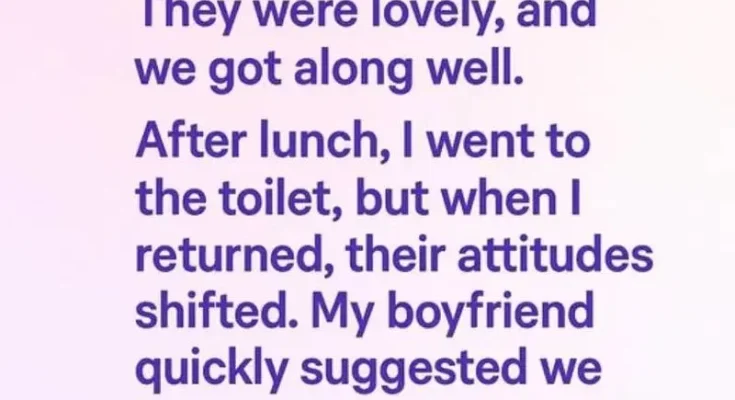 When I first met my boyfriend’s parents, I thought I had luck on my side. The afternoon began like something out of a comforting movie: warm handshakes, polite smiles, gentle jokes passed across the table. His mom brought out a casserole that reminded me of Sunday dinners at my grandmother’s house. His dad teased my boyfriend about an old high school story, and even I found myself laughing so hard my cheeks hurt.
