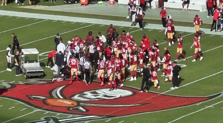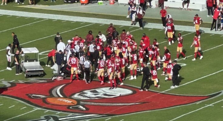 San Francisco 49ers and Tampa Bay Buccaneers players came together to pray for Fred Warner after the All-Pro linebacker suffered a gruesome-looking right leg injury in the first quarter of Sunday’s game.