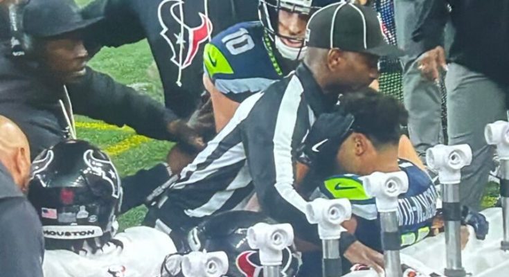 Smith-Njigba was swarmed by Texans players on the bench when a referee intervened and shielded him from outraged opponents.