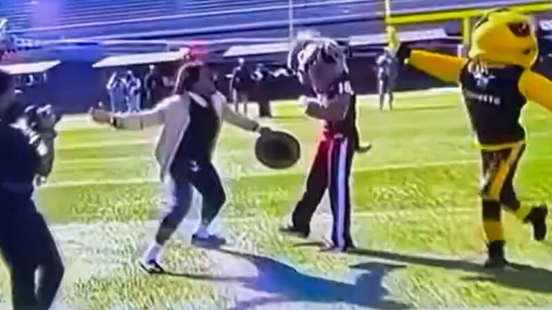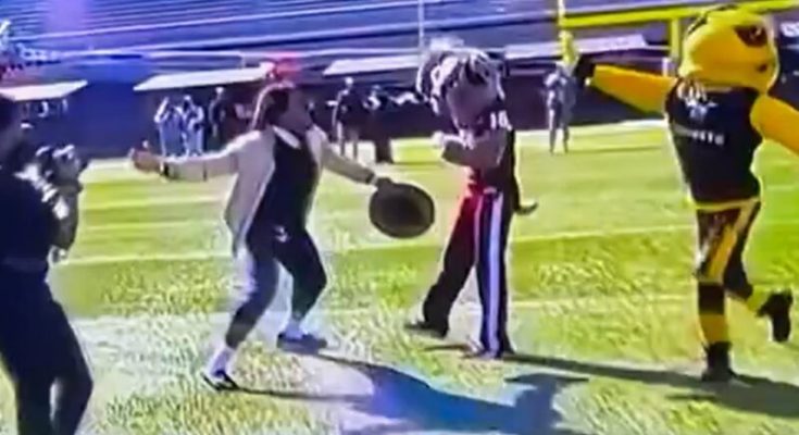 The former NFL quarterback waited at the finish line while the schools’ mascots raced in a 40-yard dash and was celebrating with the Hornets character, Stinger, when Butch, the Bulldogs mascot, knocked his hat off while trying to join in.