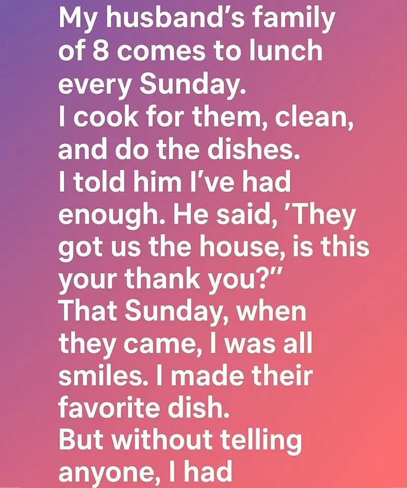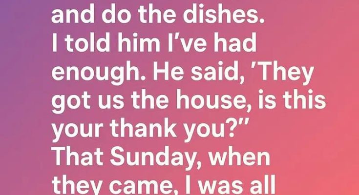 Mia’s breaking point came on an ordinary evening after one of those long Sundays. She told her husband she was tired. She asked him gently for help. Instead of understanding, he reminded her that his family had once helped them buy their home. Hosting, he said, was her way of saying “thank you.”