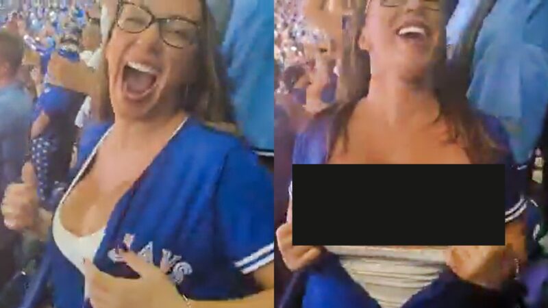 While the Blue Jays are the reason for the excitement in Toronto right now, a female fan is considered to be the real winner after flashing her breasts in the Rogers Centre stands, opening her team jersey up while pulling down the white top beneath to reveal a bouncy pair as she celebrated ecstatically.
