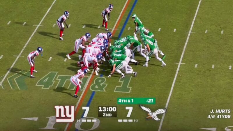 Jalen Hurts and the Eagles lined up for the tush push play on a 4th-and-1 situation. Hurts was stripped of the ball as he dove forward, and the Giants appeared to have made a clear recovery: