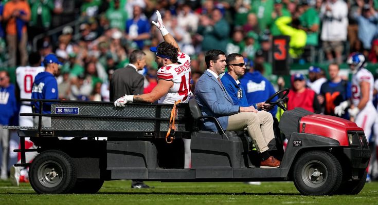 The running back had to be carted off after being tackled at midfield by Zack Baun during the second quarter at Lincoln Financial Field. The Giants later confirmed that Skattebo dislocated his ankle and was taken to the hospital for ‘further evaluation.’
