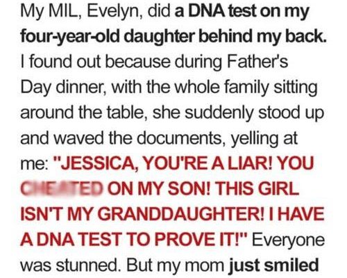 “Oh, don’t play dumb. You cheated on my son. That girl—” she pointed at Willa, who was playing with a napkin at the table, “—is not my granddaughter. And I have the DNA test to prove it.”