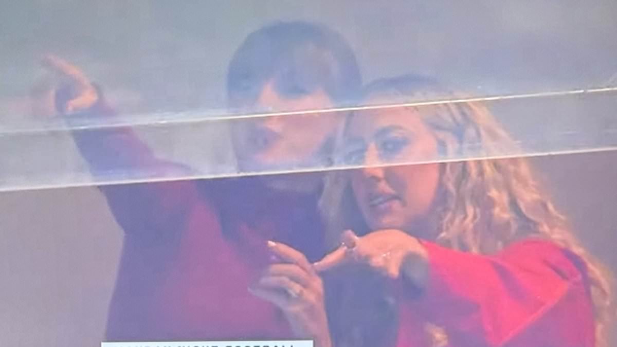 The singer, whose stunning diamond engagement ring was clearly visible, was seen celebrating in a suite with fellow Chiefs WAG Brittany Mahomes.