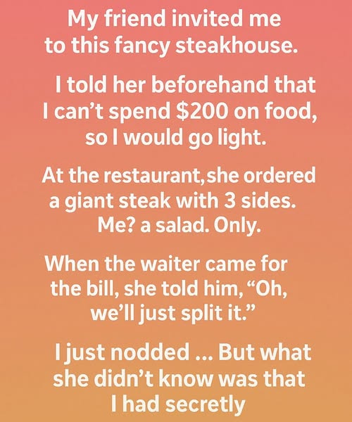 The waiter placed two receipts on the table—one for her feast, and another showing my salad had already been paid. My friend’s eyes flicked from one slip to the other. Surprise crossed her face, then a flush of embarrassment.