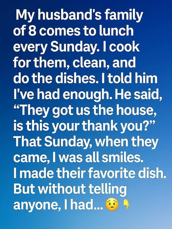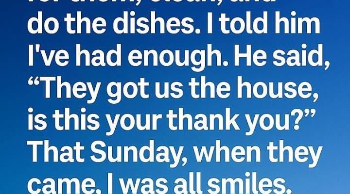 That moment changed things more than any argument ever could. The next Sunday, when his family came over, everyone brought a dish. My husband helped set the table and clear the plates afterward.