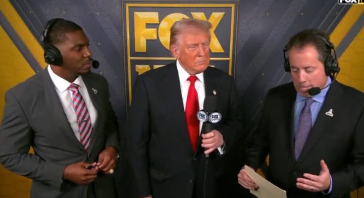 After the swearing-in ceremony, Trump hopped into the booth to call a play with Fox Sports’ announcing team.
