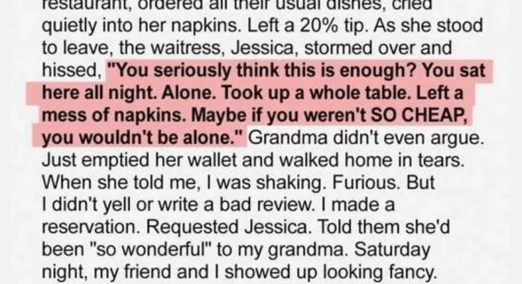 Other diners turned to look. My grandmother’s cheeks flushed with embarrassment. She quietly gathered her purse and walked out, the happy memories she had tried to hold on to now shadowed by humiliation.
