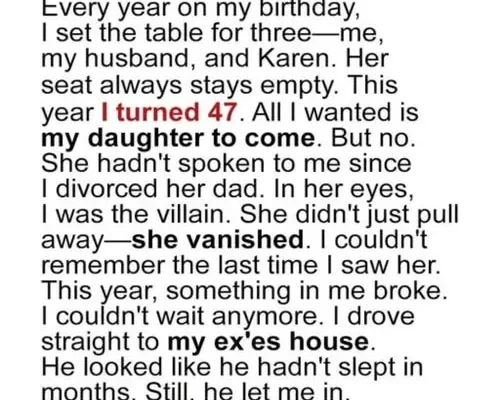 My 47th birthday came quietly—just three plates on the table, a small cake, and one empty chair. That chair had been empty for two years, ever since my daughter, Karen, and I stopped speaking. Still, every year I set her place, as if the simple ritual might somehow bridge the silence between us.