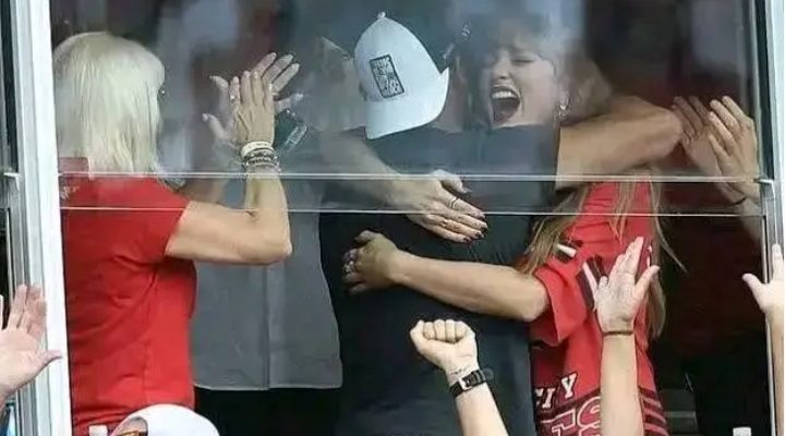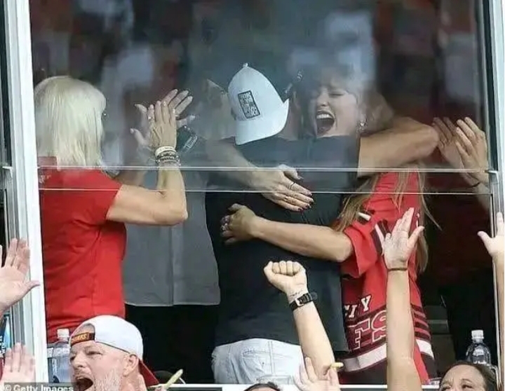 Fans around the stadium gasped. Players froze. Coaches turned. And Travis Kelce? He wrapped her in a massive hug, lifting her off the ground as he buried his face into her neck.