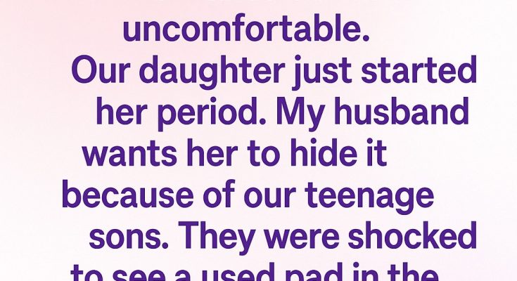 My husband wants our daughter to stop using period products because it makes our sons uncomfortable. Our daughter just started her period. My husband wants her to hide it because of our teenage sons. They were shocked to see a used pad in the trash and they avoid her when she’s on her period. The last straw was…when he suggested she stay in her room “until it’s over,” so the boys wouldn’t feel awkward. I watched my daughter’s face fall. She was already nervous about this new stage in her life, and now she was being made to feel like she had done something wrong. That night, she cried in her room—not because of pain, but because she felt ashamed for something completely natural.
