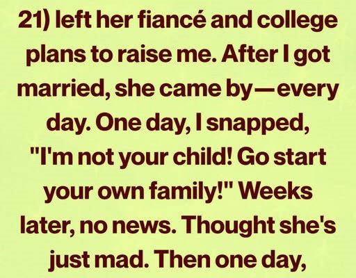 I was too young to see the cost—the dreams she gave up, the relationship she lost, and how her world slowly shrank until I was at its center. Years later, after I married and moved out, her constant presence began to feel suffocating. She visited daily, worried over small details, and treated me like a child. One night, overwhelmed, I snapped. I told her to stop hovering and live her own life.