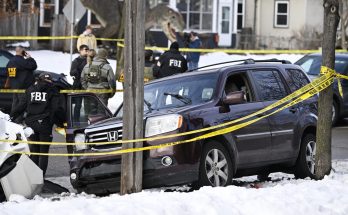 Another video shared online shows a burgundy SUV surrounded by law enforcement agents. Gunshots are heard before the vehicle crashes into a light pole. A bullet hole is visible in the driver’s side windshield. Two parked cars appear to have been struck.