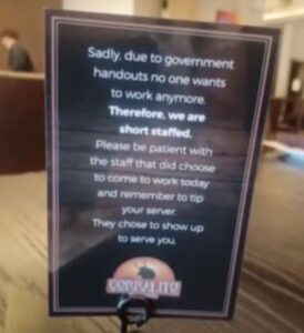 The offending message read: “Sadly, due to government handouts, no one wants to work anymore. Therefore, we are short-staffed. Please be patient with the staff that did choose to come to work today, and remember to tip your server. They chose to show up to serve you.”