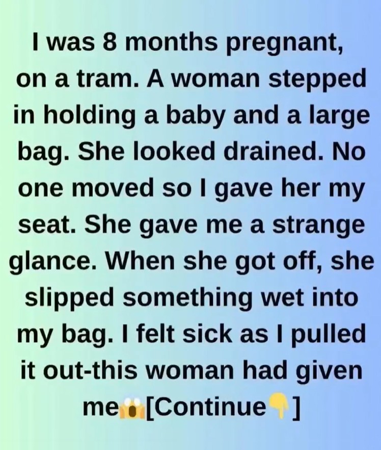 I was 8 months pregnant, on a tram. A woman stepped in holding a baby and a large bag. She looked drained. No one moved, so I gave her my seat. She gave me a strange glance.