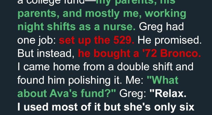 My husband Greg promised to secure our daughter Ava’s future. Instead, he spent her $45,000 college fund on a rusty 1972 Ford Bronco. That money came from both our families and months of overtime shifts I worked as a nurse. Greg had one job—deposit it in a college fund. But the moment he saw that truck, reason flew out the window.