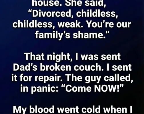 Dad died and left me nothing. My sister got the house. She said, “Divorced, childless, weak. You’re our family’s shame.” That night, I was sent Dad’s broken couch. I sent it for repair. The guy called, in panic: “Come NOW!” My blood went cold when I found hidden.At the workshop, the repairman lifted a torn cushion and revealed a narrow wooden panel built into the frame. Inside lay a stack of envelopes, a worn notebook, and a small tin box wrapped carefully in cloth.